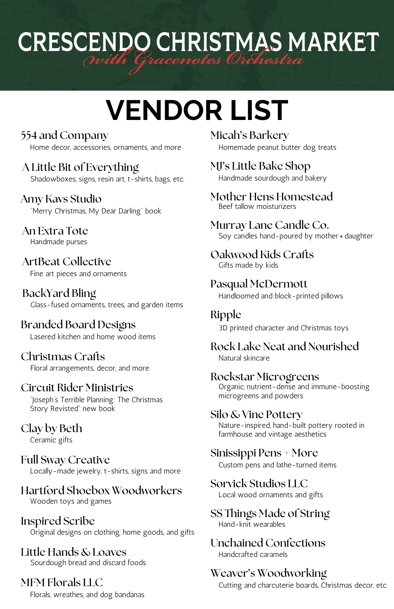 Crescendo Christmas Market is a new effort in 2025 to encourage impactful community connections in Lake Country. Guests are invited to purchase gifts from local artisans who are donating 10% of their proceeds to charities. Various ensembles from Gracenotes Orchestra will play live music during the market for guests to enjoy while they shop and dine. At 5 p.m., the market will close so guests can fully immerse in the 100+ person orchestra Christmas Concert.