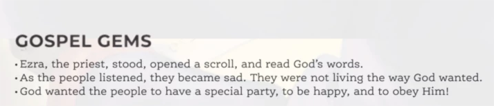 Kids will be in the Books of Ezra and Nehemiah this week. Below are some helpful Gospel Gems.