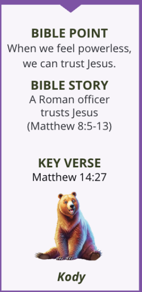 When we feel powerless, we can TRUST IN JESUS! Kids will focus on this key point for the next two weeks using the story of the Roman officer trusting Jesus in Matthew 8:5-13. Leaders will explore an experiment with wire to help them connect with the theme. Be sure to ask them about the mighty wire on the drive home! If you cannot be there, check it out here.